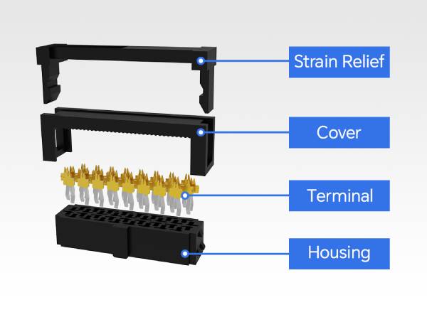 IDC W/T 應力消除裝置,其中應力消除蓋可消除應力,防止電纜因振動或外部拉動而松動,并增強公頭和母端配接期間的機械穩定性。